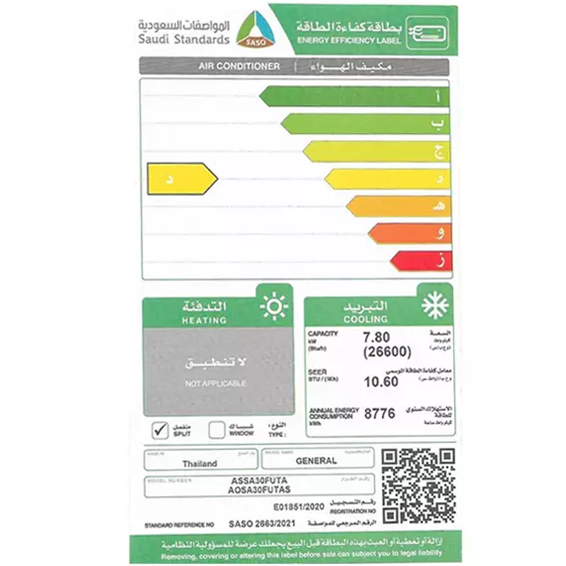 Experience powerful and reliable cooling with the O General Split Air Conditioner 26600 BTU – ASSA30FUTA. Designed to deliver high cooling performance for large spaces, this unit reflects O General’s trusted quality and durability, making it ideal for residential or commercial use.