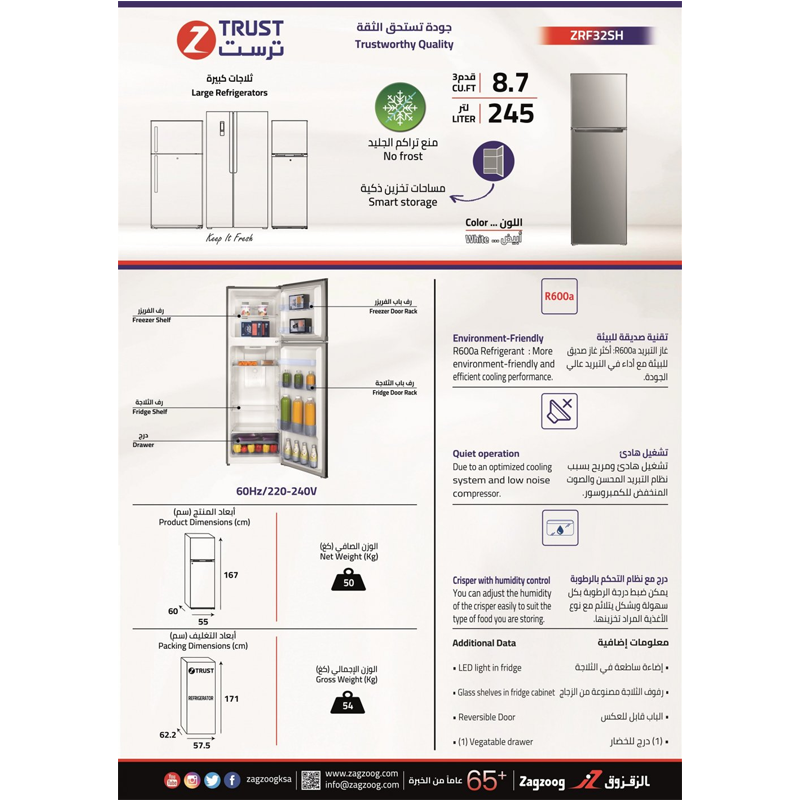 Experience reliable cooling with the Z.Trust ZRF32SH Refrigerator, featuring a practical 8.7 cu.ft (245L) capacity ideal for homes, offices, and small spaces. Designed with adjustable shelves, low energy consumption, and a sleek modern look, this refrigerator delivers long-lasting freshness and efficient daily performance.