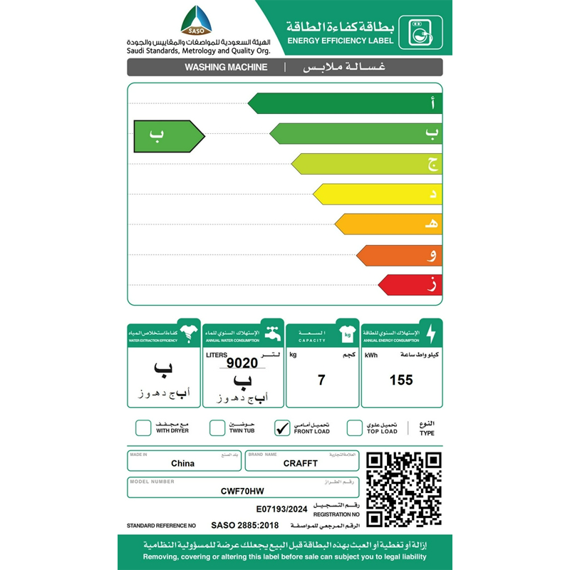 كرافت غسالة اتوماتيك فتحة أمامية 7 كيلو أبيض – CWF70HW
