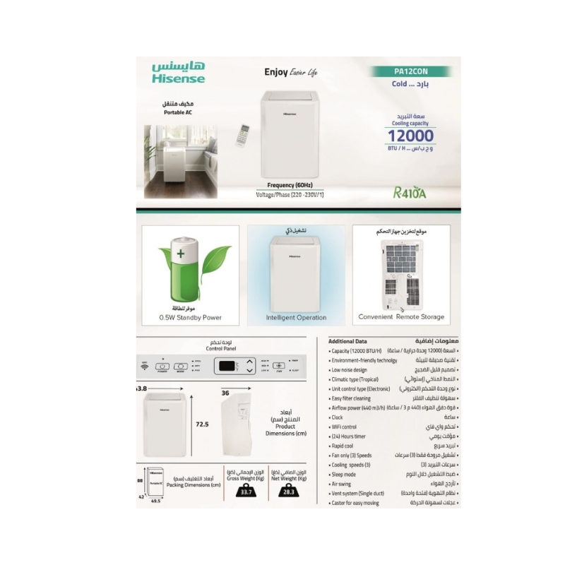 هايسنس مكيف متنقل 12000 وحدة، بارد – PA12CON
